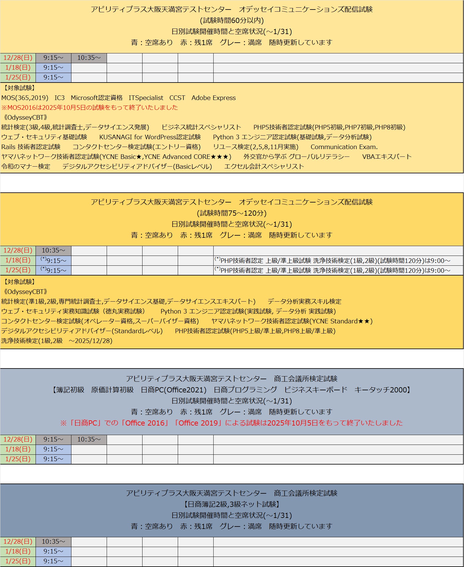 試験開催日程と空席状況のお知らせ(MOS,OdysseyCBT,日商など) 投稿日: 2023年8月23日2025年12月17日 投稿者: webmaster この表は随時更新しております。現在満席表示でも、キャンセル等で空席が発生した場合は早急に反映いたします。 お申し込みはこちらから → 検定試験お申込み
