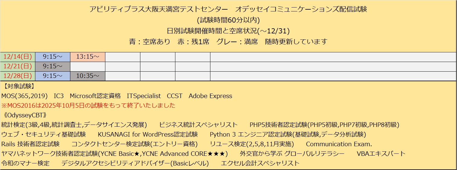 MOS試験 随時申し込み受付中 投稿日: 2019年9月3日2025年12月5日 投稿者: wpmaster この表は随時更新しております。現在満席表示でも、キャンセル等で空席が発生した場合は早急に反映いたします。 MOS2019,365試験を開催しています。 弊社会場は2025年10月5日でMOS2016を終了いたしました。 また、MOS対策講座も実施しています。 MOSのご案内 MOS試験のお申込みはこちら ※電話でのお申し込みは承っておりません。 当試験会場は、株式会社オデッセイ コミュニケーションズから委託を受け、試験を運営しています。 入力された個人情報は、株式会社オデッセイ コミュニケーションズが収集し、お客様が申込まれた資格試験の実施運営のみに利用します。なお、各試験の受験時に登録される個人情報については、受験時に提示されるプライバシーポリシーに基づき執り行います。この申込を試験会場へ送信すると、上記利用目的に同意いただいたものとみなします。 個人情報の取扱いに関する情報やお問合せ窓口は、株式会社オデッセイ コミュニケーションズのプライバシーポリシー( https://www.odyssey-com.co.jp/privacy/ )をご覧ください。 名前必須 姓 (例:試験)名 (例:太郎) カタカナ姓 (例:シケン)カタカナ名 (例:タロウ) 性別必須 男女非回答 生年月日必須(入力後お間違いないか確認をお願いします) 郵便番号必須 都道府県必須 市区町村以降住所必須(番地までご記入ください) 電話番号1必須 電話番号2 メールアドレス必須(各携帯キャリアのメールアドレスで迷惑メール対策設定をされている方は、「@abilityplus.co.jp」が受信できるよう設定変更をお願いします) 試験希望日時必須 2025/12/14(日) 9:15-2025/12/14(日) 13:15-2025/12/28(日) 9:15- 受験科目必須 選択してくださいMOS Word365MOS Excel365MOS PowerPoint365MOS Word365ExpertMOS Excel365ExpertMOS Word2019MOS Excel2019MOS PowerPoint2019MOS Outlook2019MOS Word2019ExpertMOS Excel2019ExpertMOS Access2019Expert 受験チケットの利用必須(はいの方はメッセージ欄に受験チケット番号をご記入ください) はいいいえ お支払い方法 銀行振込 領収書発行希望必須(はいの方はメッセージ欄に「宛名に記載する名称」をご記入ください領収書は当日試験会場でお渡しいたします) はいいいえ 学割対象必須(学割の適用については各試験のwebサイトでご確認ください) はいいいえ 《学割対象の方》学校名 メッセージ 確認画面は表示されません。上記内容で送信いたしますので、よろしければ文末のチェックボックスにチェックを入れて、送信ボタンを押してください。