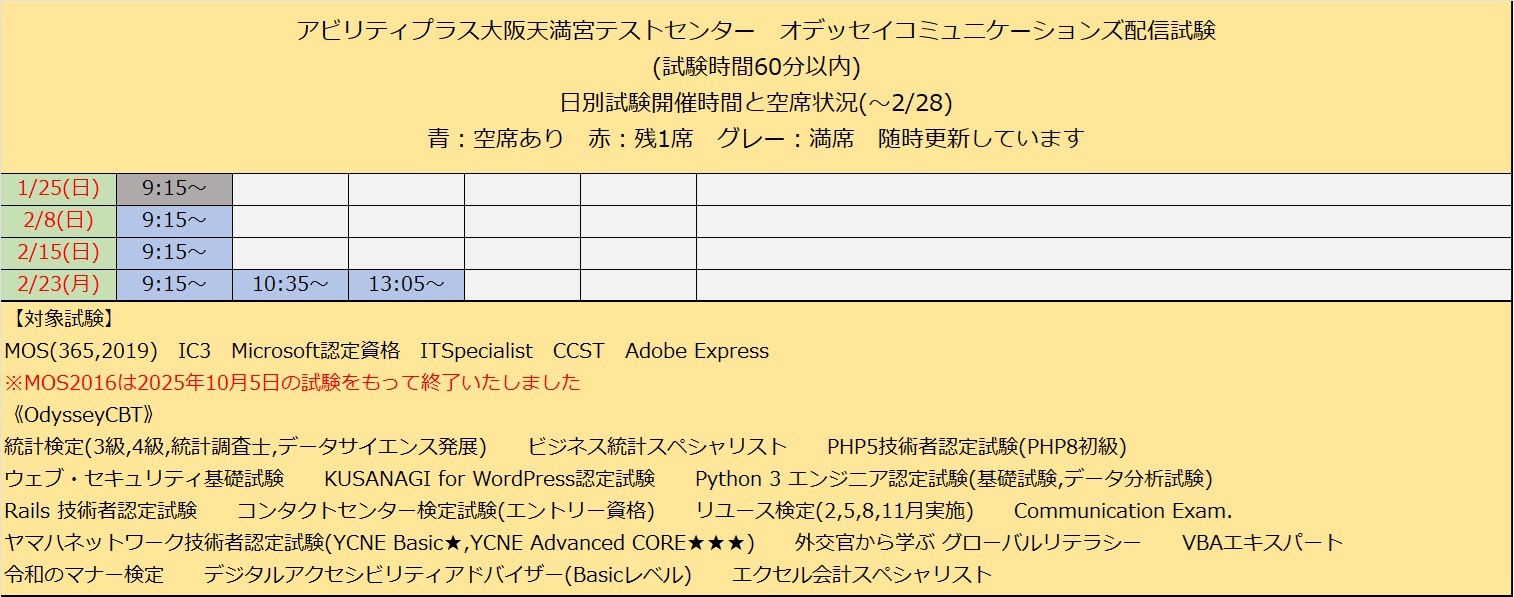 MOS試験 随時申し込み受付中 投稿日: 2019年9月3日2026年1月14日 投稿者: wpmaster この表は随時更新しております。現在満席表示でも、キャンセル等で空席が発生した場合は早急に反映いたします。 MOS2019,365試験を開催しています。 弊社会場は2025年10月5日でMOS2016を終了いたしました。 また、MOS対策講座も実施しています。 MOSのご案内 MOS試験のお申込みはこちら ※電話でのお申し込みは承っておりません。 当試験会場は、株式会社オデッセイ コミュニケーションズから委託を受け、試験を運営しています。 入力された個人情報は、株式会社オデッセイ コミュニケーションズが収集し、お客様が申込まれた資格試験の実施運営のみに利用します。なお、各試験の受験時に登録される個人情報については、受験時に提示されるプライバシーポリシーに基づき執り行います。この申込を試験会場へ送信すると、上記利用目的に同意いただいたものとみなします。 個人情報の取扱いに関する情報やお問合せ窓口は、株式会社オデッセイ コミュニケーションズのプライバシーポリシー( https://www.odyssey-com.co.jp/privacy/ )をご覧ください。 名前必須 姓 (例:試験)名 (例:太郎) カタカナ姓 (例:シケン)カタカナ名 (例:タロウ) 性別必須 男女非回答 生年月日必須(入力後お間違いないか確認をお願いします) 郵便番号必須 都道府県必須 市区町村以降住所必須(番地までご記入ください) 電話番号1必須 電話番号2 メールアドレス必須(各携帯キャリアのメールアドレスで迷惑メール対策設定をされている方は、「@abilityplus.co.jp」が受信できるよう設定変更をお願いします) 試験希望日時必須 2026/2/8(日) 9:15-2026/2/15(日) 9:15-2026/2/23(月) 9:15-2026/2/23(月) 10:35-2026/2/23(月) 13:05- 受験科目必須 選択してくださいMOS Word365MOS Excel365MOS PowerPoint365MOS Word365ExpertMOS Excel365ExpertMOS Word2019MOS Excel2019MOS PowerPoint2019MOS Outlook2019MOS Word2019ExpertMOS Excel2019ExpertMOS Access2019Expert 受験チケットの利用必須(はいの方はメッセージ欄に受験チケット番号をご記入ください) はいいいえ お支払い方法 銀行振込 領収書発行希望必須(はいの方はメッセージ欄に「宛名に記載する名称」をご記入ください領収書は当日試験会場でお渡しいたします) はいいいえ 学割対象必須(学割の適用については各試験のwebサイトでご確認ください) はいいいえ 《学割対象の方》学校名 メッセージ 確認画面は表示されません。上記内容で送信いたしますので、よろしければ文末のチェックボックスにチェックを入れて、送信ボタンを押してください。