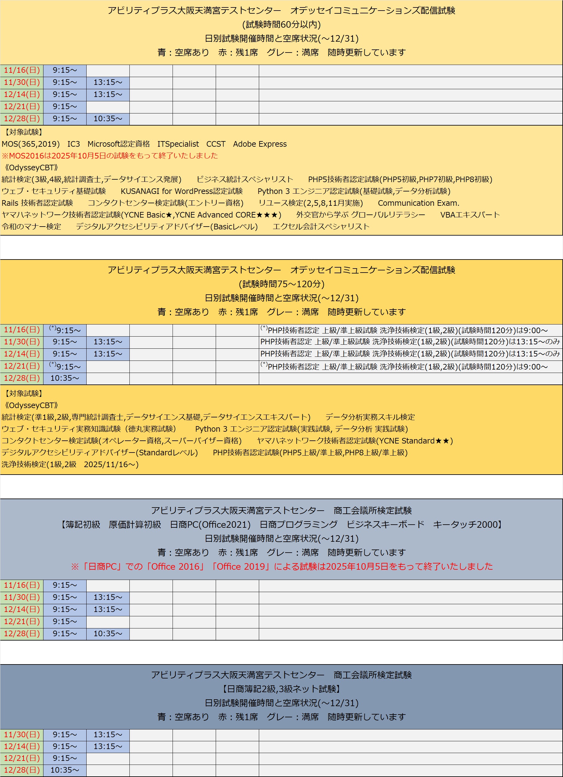 試験開催日程と空席状況のお知らせ(MOS,OdysseyCBT,日商など) 投稿日: 2023年8月23日2025年11月3日 投稿者: webmaster この表は随時更新しております。現在満席表示でも、キャンセル等で空席が発生した場合は早急に反映いたします。 お申し込みはこちらから → 検定試験お申込み