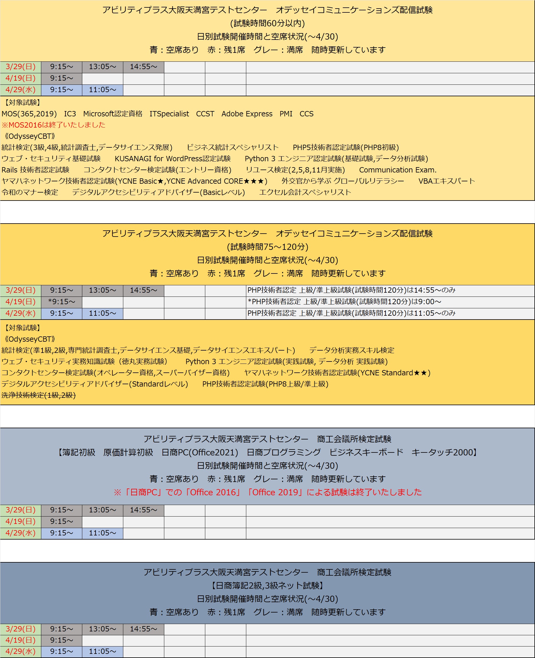 試験開催日程と空席状況のお知らせ(MOS,OdysseyCBT,日商など) 投稿日: 2023年8月23日2026年3月21日 投稿者: webmaster この表は随時更新しております。現在満席表示でも、キャンセル等で空席が発生した場合は早急に反映いたします。 お申し込みはこちらから → 検定試験お申込み