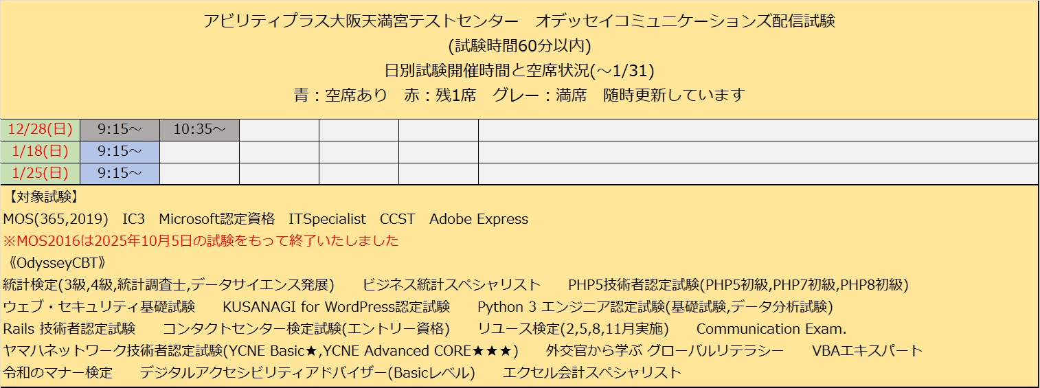 MOS試験 随時申し込み受付中 投稿日: 2019年9月3日2025年12月15日 投稿者: wpmaster この表は随時更新しております。現在満席表示でも、キャンセル等で空席が発生した場合は早急に反映いたします。 MOS2019,365試験を開催しています。 弊社会場は2025年10月5日でMOS2016を終了いたしました。 また、MOS対策講座も実施しています。 MOSのご案内 MOS試験のお申込みはこちら ※電話でのお申し込みは承っておりません。 当試験会場は、株式会社オデッセイ コミュニケーションズから委託を受け、試験を運営しています。 入力された個人情報は、株式会社オデッセイ コミュニケーションズが収集し、お客様が申込まれた資格試験の実施運営のみに利用します。なお、各試験の受験時に登録される個人情報については、受験時に提示されるプライバシーポリシーに基づき執り行います。この申込を試験会場へ送信すると、上記利用目的に同意いただいたものとみなします。 個人情報の取扱いに関する情報やお問合せ窓口は、株式会社オデッセイ コミュニケーションズのプライバシーポリシー( https://www.odyssey-com.co.jp/privacy/ )をご覧ください。 名前必須 姓 (例:試験)名 (例:太郎) カタカナ姓 (例:シケン)カタカナ名 (例:タロウ) 性別必須 男女非回答 生年月日必須(入力後お間違いないか確認をお願いします) 郵便番号必須 都道府県必須 市区町村以降住所必須(番地までご記入ください) 電話番号1必須 電話番号2 メールアドレス必須(各携帯キャリアのメールアドレスで迷惑メール対策設定をされている方は、「@abilityplus.co.jp」が受信できるよう設定変更をお願いします) 試験希望日時必須 2026/1/18(日) 9:15-2026/1/25(日) 9:15- 受験科目必須 選択してくださいMOS Word365MOS Excel365MOS PowerPoint365MOS Word365ExpertMOS Excel365ExpertMOS Word2019MOS Excel2019MOS PowerPoint2019MOS Outlook2019MOS Word2019ExpertMOS Excel2019ExpertMOS Access2019Expert 受験チケットの利用必須(はいの方はメッセージ欄に受験チケット番号をご記入ください) はいいいえ お支払い方法 銀行振込 領収書発行希望必須(はいの方はメッセージ欄に「宛名に記載する名称」をご記入ください領収書は当日試験会場でお渡しいたします) はいいいえ 学割対象必須(学割の適用については各試験のwebサイトでご確認ください) はいいいえ 《学割対象の方》学校名 メッセージ 確認画面は表示されません。上記内容で送信いたしますので、よろしければ文末のチェックボックスにチェックを入れて、送信ボタンを押してください。